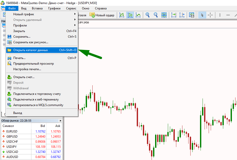 Также индикатор можно скачать в сети. Полученный файл следует скопировать в папку «Indicators». Чтобы найти ее, следует зайти в терминал и нажать «Файл». Далее пройти в «Открыть каталог», затем – в «MQL4», где и будет папка с индикаторами.