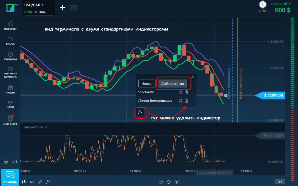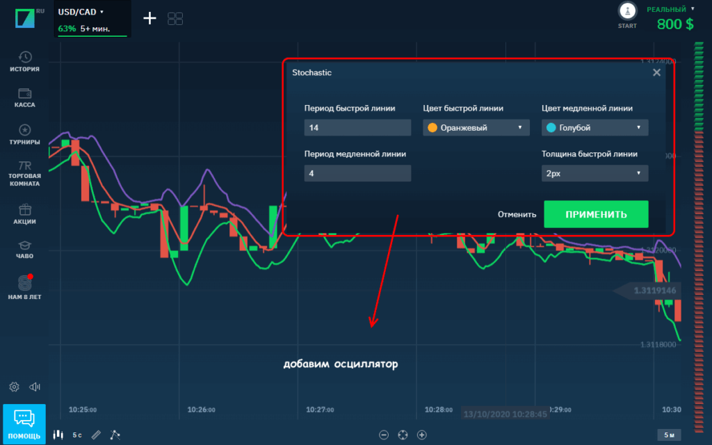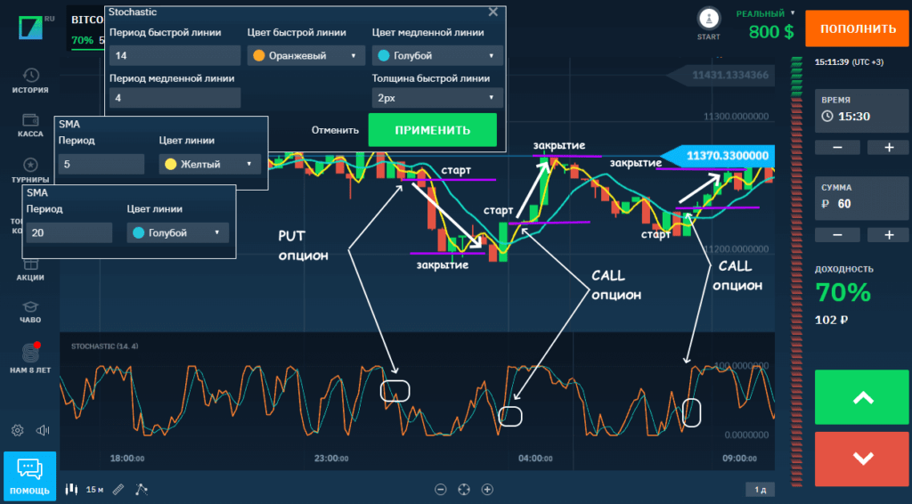 Новичкам лучше дождаться момента, когда пересечение линий будет сразу после выхода из крайних зон, как на рисунке в случае CALL опционов, и только тогда войти в рынок. Более опытные трейдеры могут открываться на пересечении около средней линии (см. PUT опцион). Но, еще раз напоминаем, что линия баланса в таком осцилляторе не выводится, поэтому достиг Стохастик уровня 50 или нет, приходится определять интуитивно. Это, конечно, точности сигналам не добавляет.