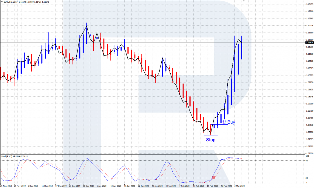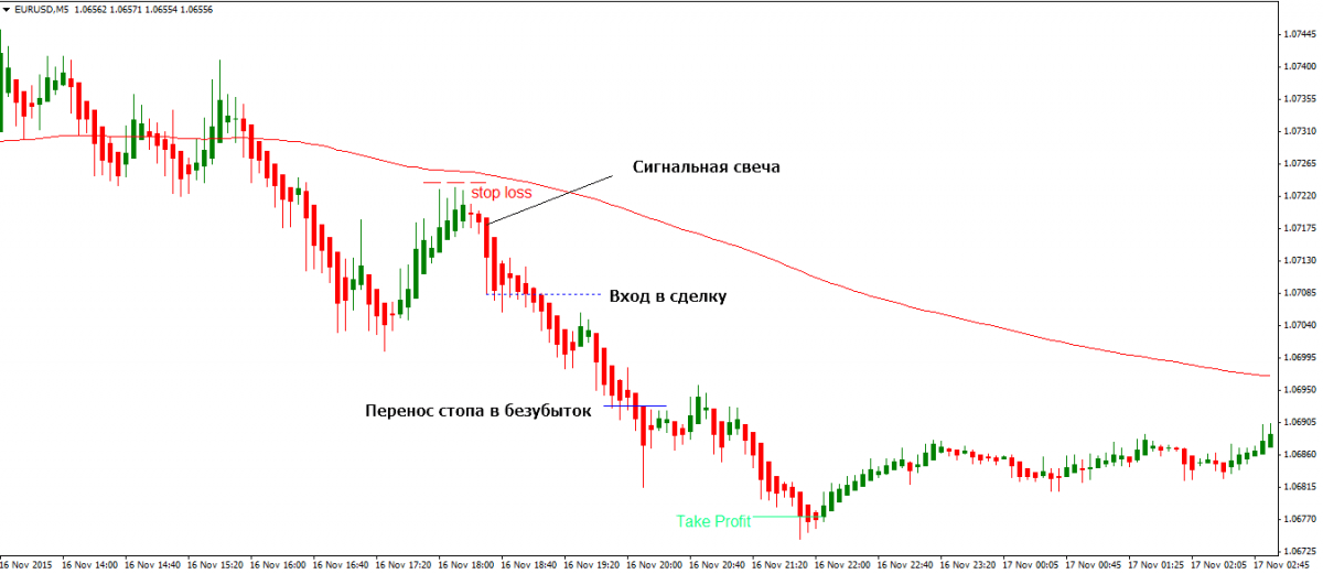 - Перед открытием сделки на графике должно сформироваться не меньше трех свечей одной направленности. При этом направленность должна соответствовать типу сделки, то есть, медвежьи свечи при открытии ордера Sell и бычьи при открытии ордера Buy.