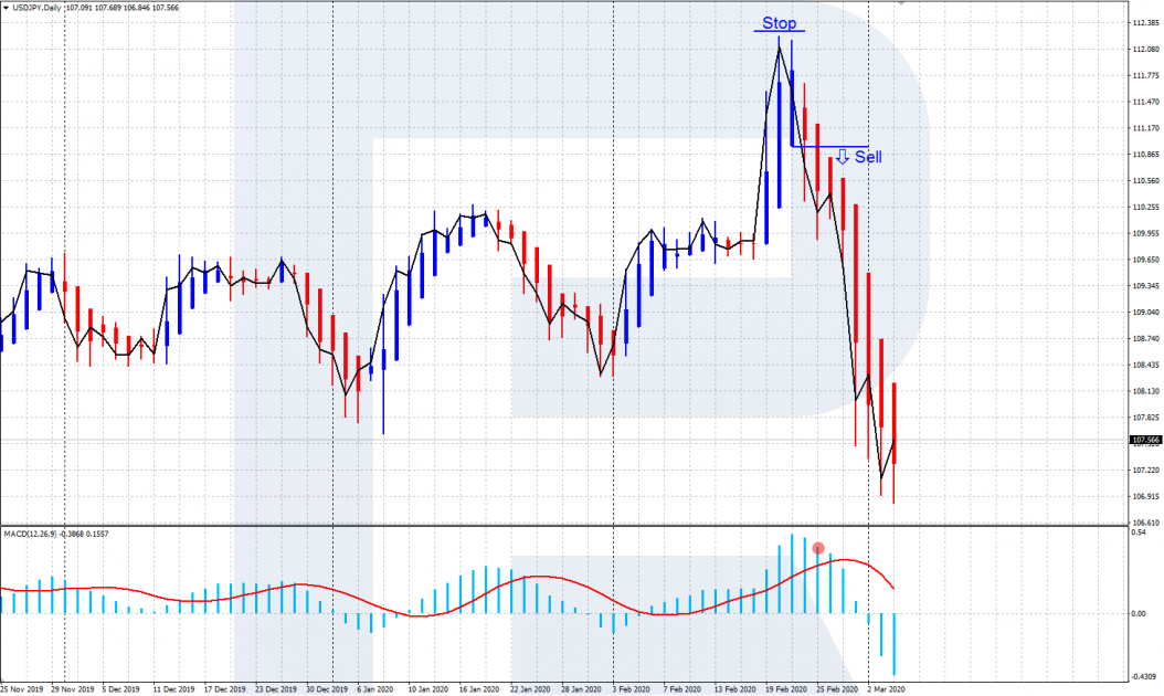 На развороте первый сигнал появляется на линии баров Хайкен Аши, входим после подтверждения от MACD. Экспирация опциона – не менее 2-3 баров.