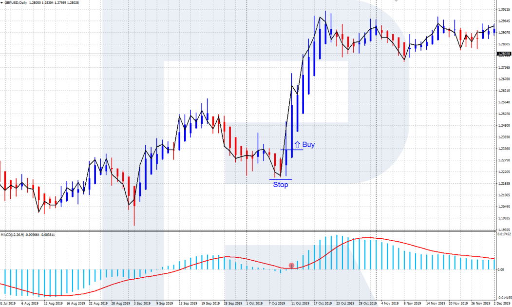Авторы стратегии рекомендуют открывать опцион на покупку только после появления трех зеленых баров, подтвержденных ростом гистограммы MACD, но можно рискнуть войти на развороте – снизу вверх – и условия могут быть более лояльными.