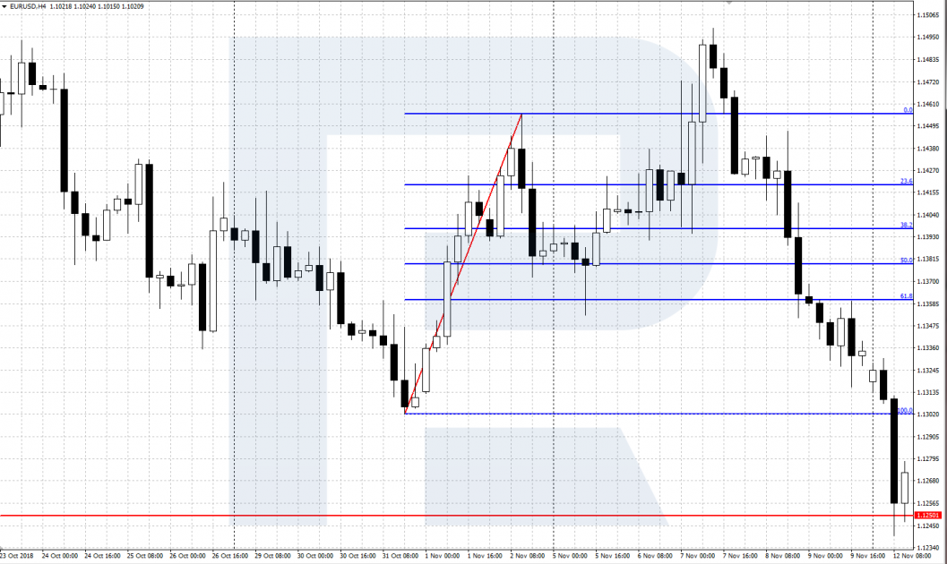 Индикатор «Уровни Фибоначчи» представляет собой сетку из нескольких уровней коррекции, которая накладывается на график цены. Выбирается сильный завершившийся ценовой импульс, на который наносятся уровни коррекции Фибоначчи. Затем нужно дождаться завершения коррекционного движения на одном из этих уровней, после чего можно входить в сделку в направлении начального импульса.
