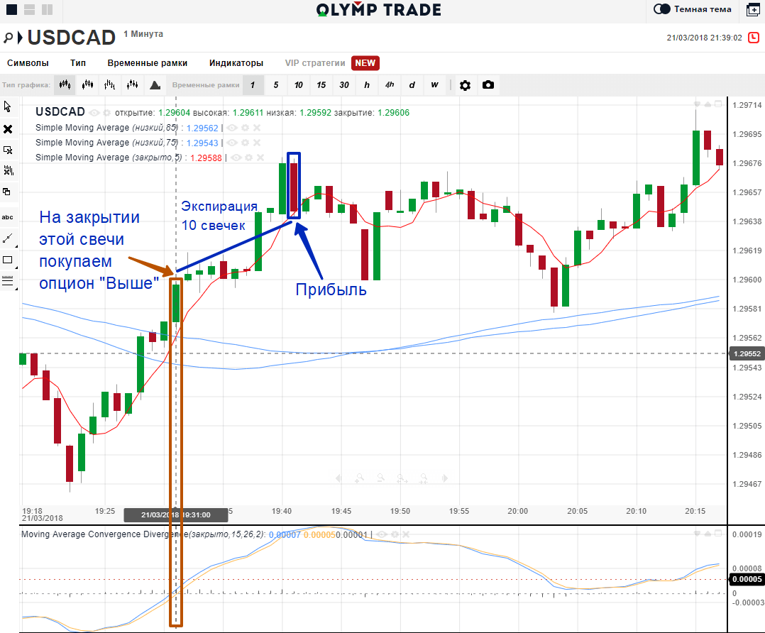 После этого переходим к определению торговых сигналов и торговле опционами. Используя стратегию “Дровосек”, стоит торговать классическими ВЫШЕ/НИЖЕ. Такой вариант представляется наиболее приемлемым и прибыльным
