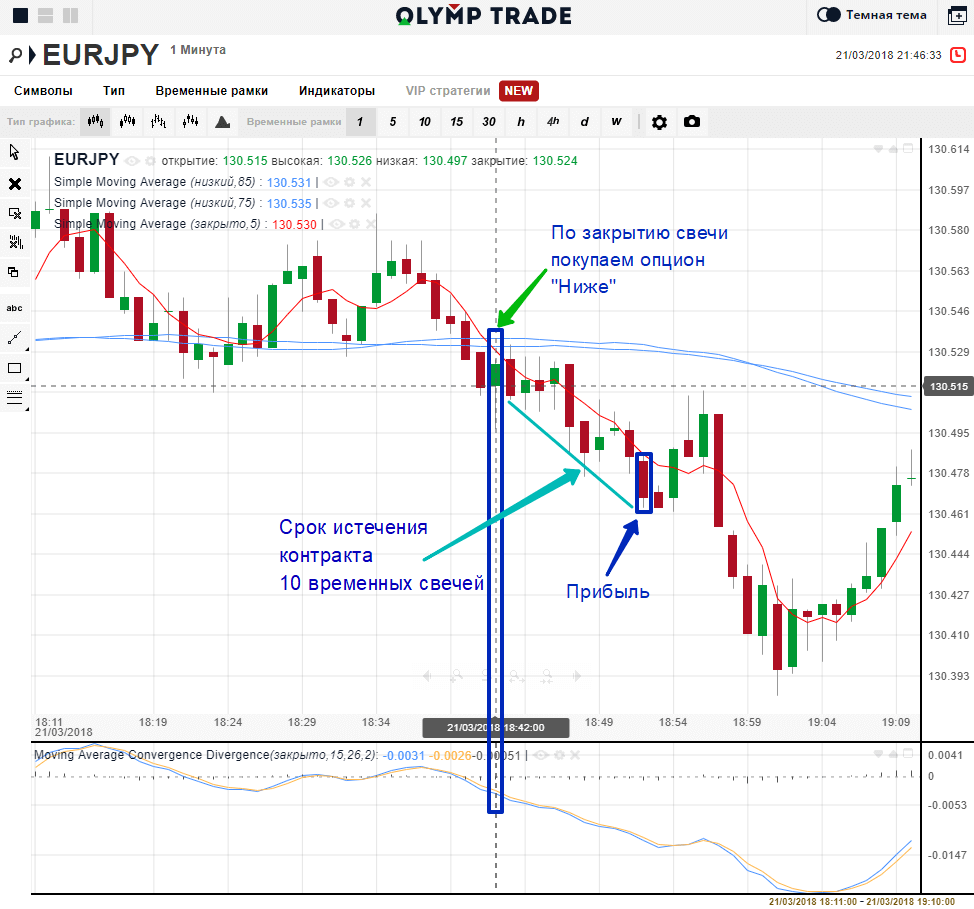 Линии Moving Average должны пересечься. Сигнальные линии MACD пересекут нулевой уровень в направлении снизу вверх. Появление таких показателей становится сигналом к переходу на страницу брокера для оформления сделки ВВЕРХ.