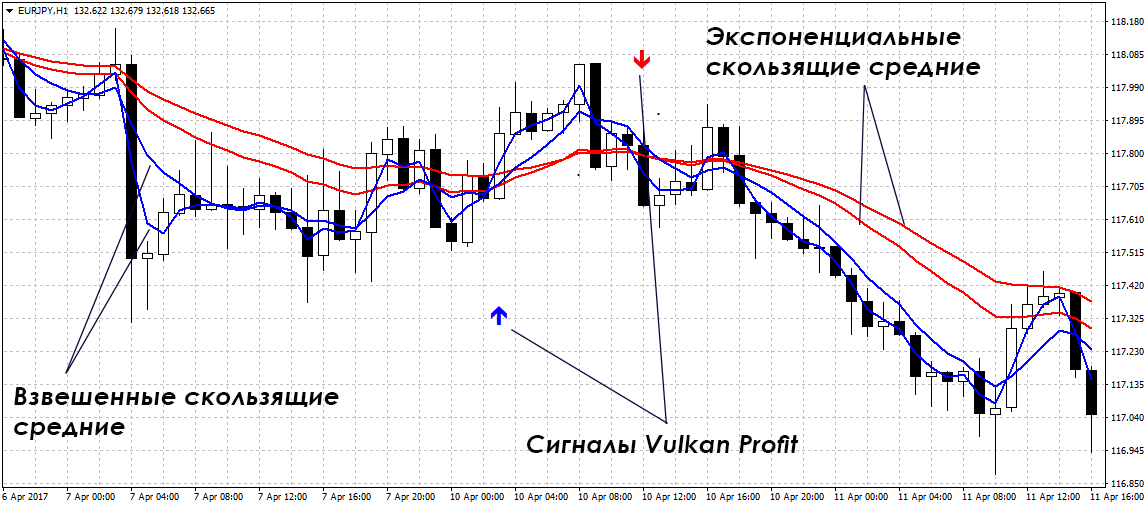 На графике скользящие средние не отображаются, мы их добавили для демонстрации того, как работает Vulkan Profit. Стрелка на графике отображается после того, как WMA3 пересекает обе экспоненциальные скользящие средние. Направление WMA8 используется как фильтр.