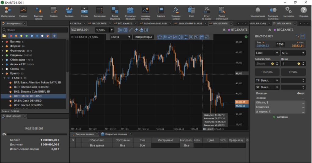 Криптовалюты. Также на едином мультивалютном счете в терминале Exante доступна торговля криптовалютами. В общей сложности трейдерам доступно 23 криптовалютных инструмента, в том числе 21 валюта в паре с долларом США — Bitcoin (BTC), Bitcoin Cash (BCH), Ethereum (ETH), Ethereum Classic (ETC), Ripple (XRP), Litecoin (LTC), Binance Coin (BNB), Dash (DASH), Decred (DCR), EOS (EOS), IOTA (IOTA), Maker (MKR), NEO (NEO), OmiseGo (OMG), QTUM (QTUM), Amoveo (VEO), Stellar (XLM), Monero (XMR), ZCash (ZEC), 0x (ZRX), Basic Attention Token (BAT), а также два индекса — DeFi coin index (DEFIX) и Altcoin Index (XAI).
