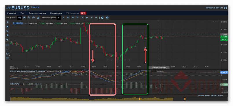При продажах действуют противоположные правила. 3 осциллятора должны оказаться в области перекупленности — в такой момент при открытии следующей пятиминутной свечи покупается опцион Put.