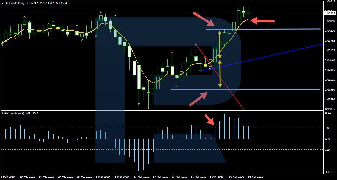 - Дожидаемся того, чтобы на таймфрейме H4 желтая сигнальная линия и гистограмма оказались ниже уровня перепроданности (можно рассматривать варианты, когда сигнальная линия и гистограмма находятся у зоны перепроданности).