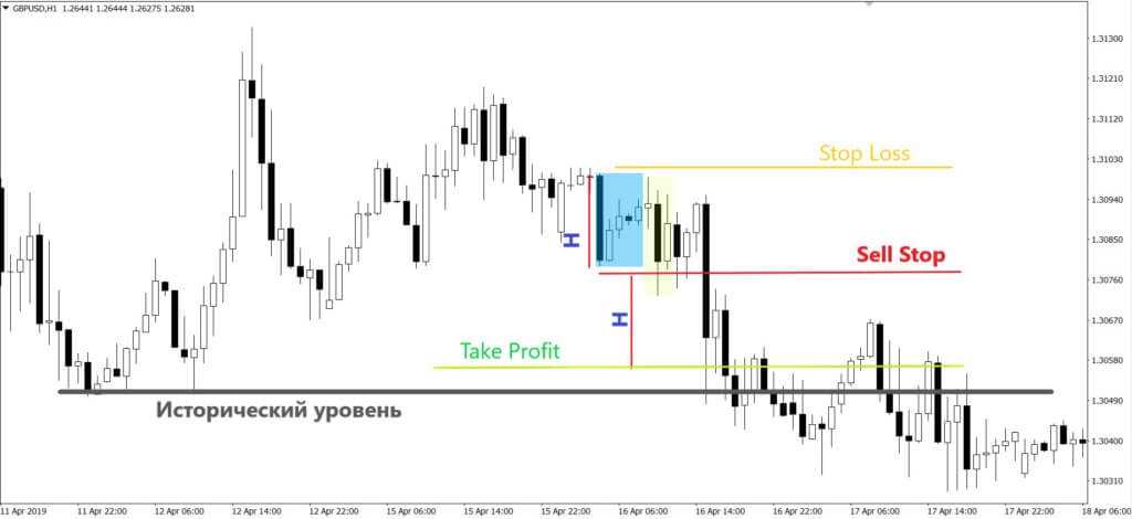 На следующем примере видно, как после образования нужного нам паттерна цена пошла вниз, и сработал ордер Sell Stop. Ордер на продажу выставлять было можно без опасений, поскольку сильный исторический уровень находится чуть дальше, чем высота первой свечи H. А вот Buy Stop нужно было, если и выставлять, то с опаской, поскольку тейк-профит приходился бы прямо на сильный уровень сопротивления, от которого недавно рынок уже дважды сильно отскакивал вниз. В любом случае на втором часу после формирования паттерна был открыт ордер на продажу, а на покупку был бы удален. Затем цена ушла выше, образуя текущий минус. До стопа она не дотянулась, а продолжила свое падение, и сделка закрылась спустя 5 часов по тейк-профиту.