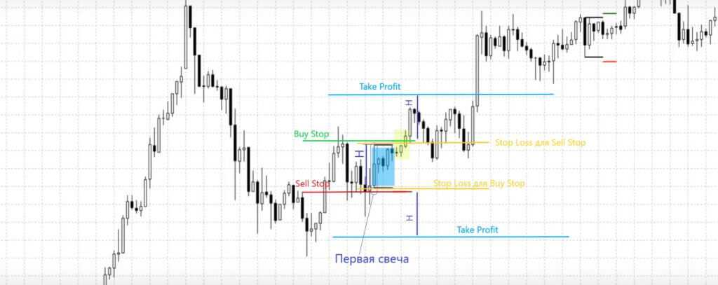 - На несколько пунктов выше максимума первой свечи устанавливается отложенный ордер на пробитие Buy Stop, а ниже минимума ставится Sell Stop.