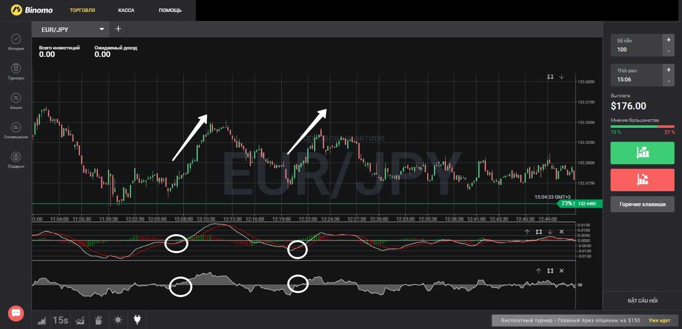 Эффективность и надежность такого стиля торговли будет продемонстрирована на примере системы с использованием индикаторов MACD и RSI – данные средства анализа, благодаря их наличию в терминале Binomo и специализированным настройкам можно использовать как эффективные скальпинг индикаторы для бинарных опционов.