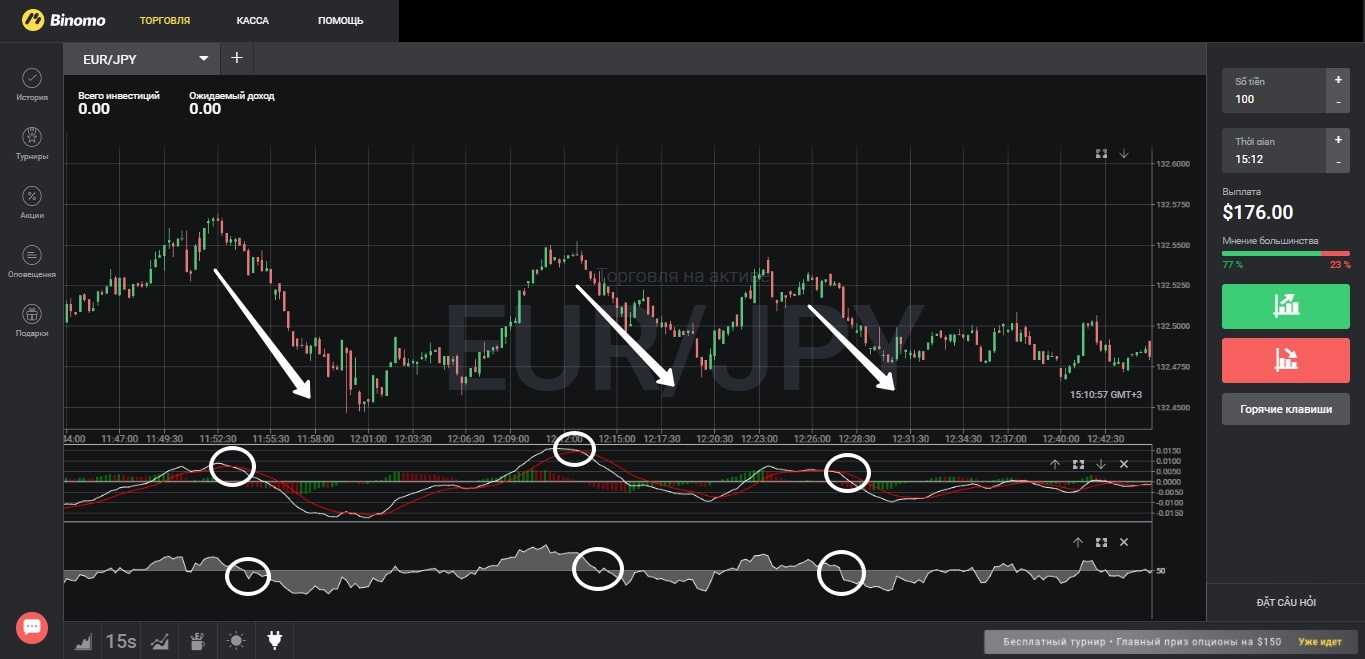 Индикатор MACD в скальпинг стратегии для бинарных опционов используется для определения разворотов краткосрочного тренда – его сигналы отображаются в виде пересечения двух мувингов. Опережающий осциллятор RSI фильтрует сигналы MACD, подтверждая, что новая тенденция закрепилась и продлиться достаточное количество времени, чтобы заключить сделку бинарным опционом.