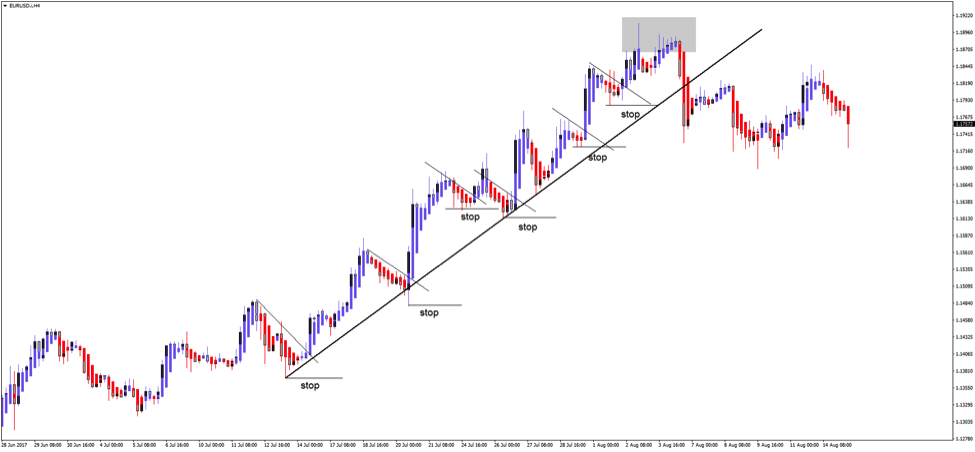 С Heikin Ashi откаты в тренде легко распознать. Для этого нужно начертить линию тренда, и подчеркнуть откаты в тренде. Нижняя тень указывает, где выставлять Stop-Loss. А Take Profit обычно выставляют в районе уровня поддержки/сопротивления