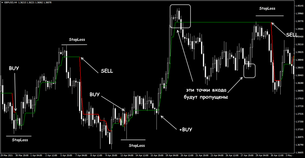 StopLoss можно перемещать параллельно линии индикатора. Оптмальными таймфремами для входа и сопровождения сделки считается H1-H4.