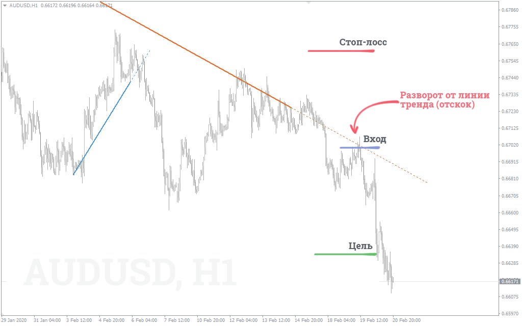 - Когда произойдет отскок от линии тренда, откройте короткую позицию.