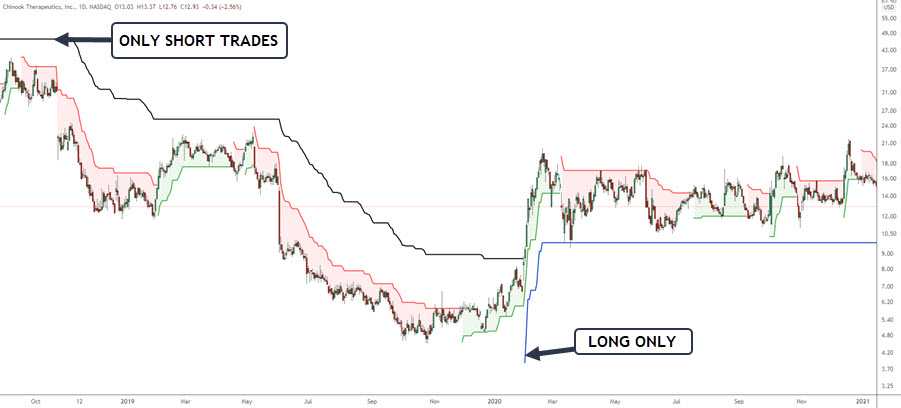 On the left, we are only allowed short trades as the longer term indicator is set to shorts only. If the short term flips to green, we must ignore that setup using the basic strategy parameters.