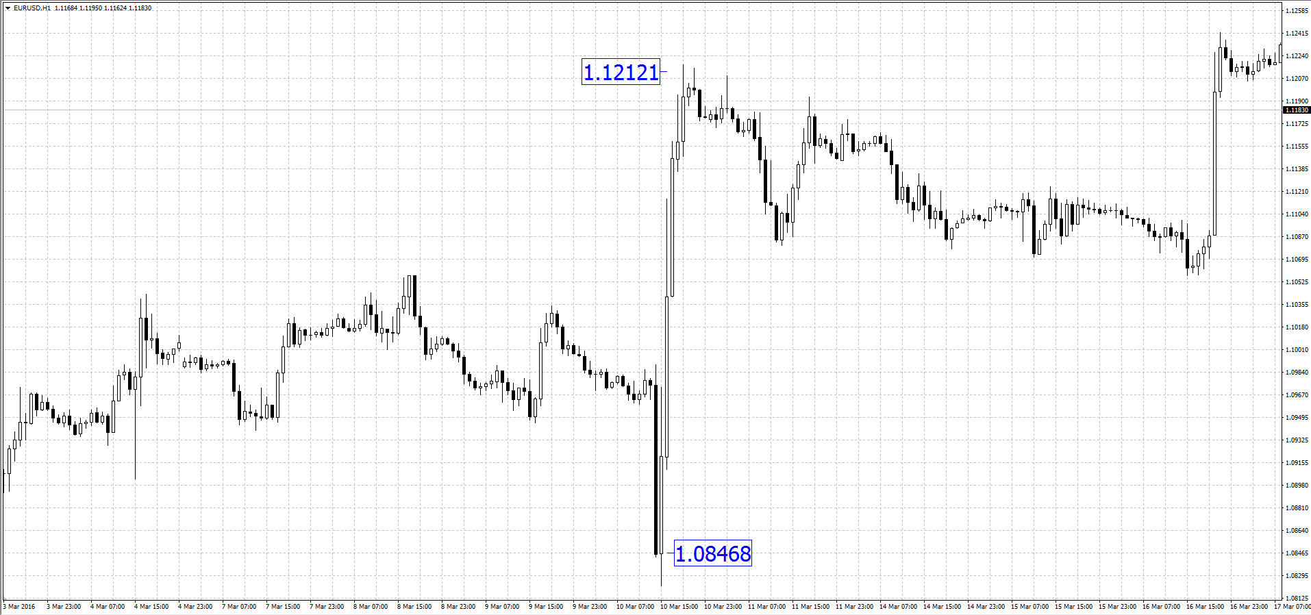 Но в одном вы можете быть уверенными точно: любое важное заседание ЕЦБ или выступление Драги почти гарантированно вызовет повышенную волатильность, ралли и даже односторонние импульсы! Это наглядно подтверждает реакция рынка на выступление Драги после заседания ЕЦБ 10 марта 2016 г. Сначала ЕЦБ расширил программу выкупа активов и снизил учетные ставки – это вызвало снижение EURUSD сразу на 127 пунктов