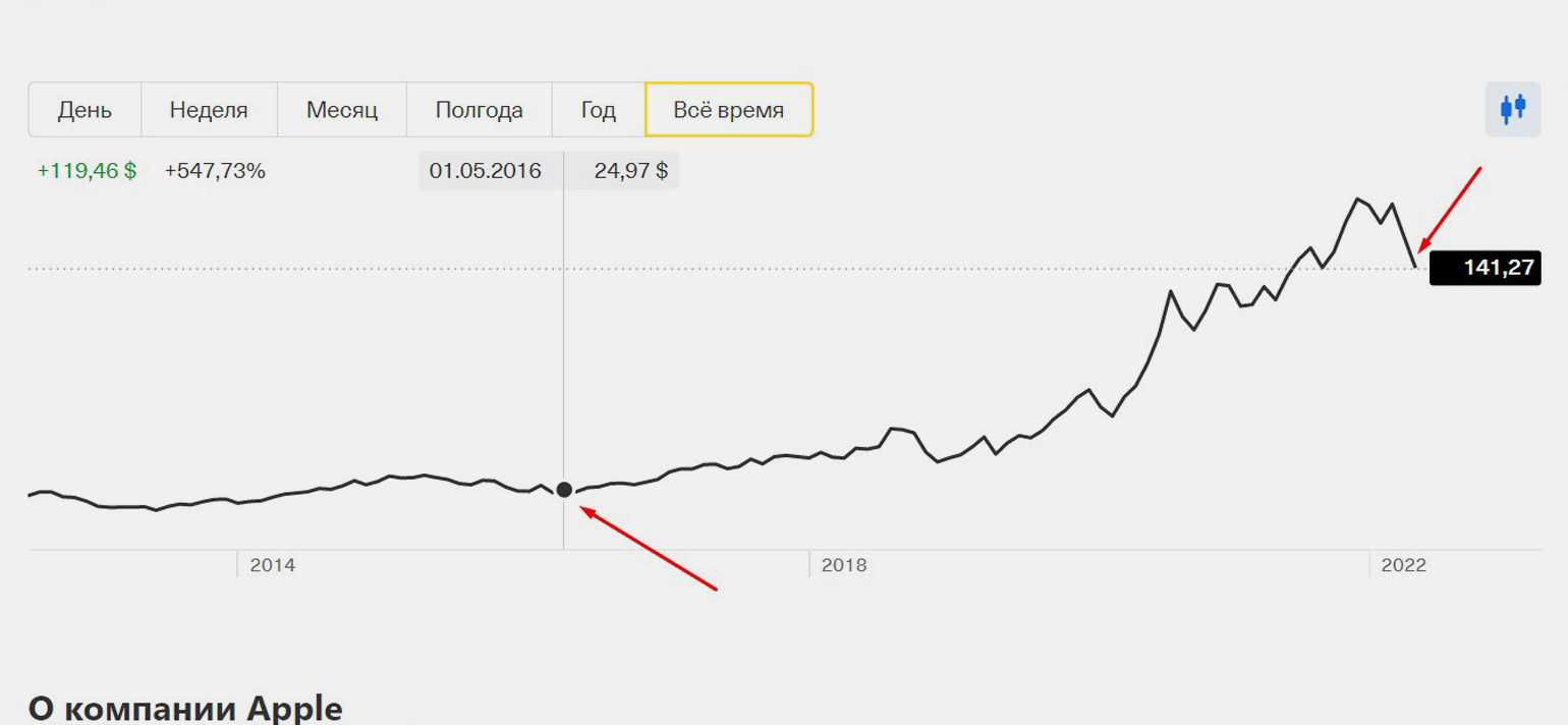 Инвестор мог купить акции Apple в 2016 году, когда они стоили 24,97 доллара за штуку, — сегодня они стоят уже 141,27 доллараСкриншот: «Тинькофф»