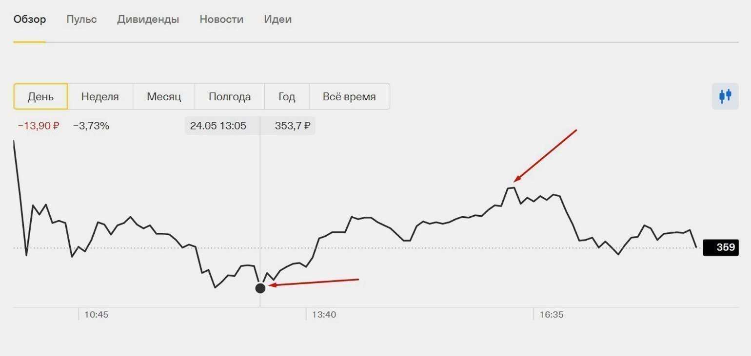 Например, трейдер может купить акции «Татнефти», когда они стоят 353,7 рубля за штуку, а продать через пару часов, когда их стоимость достигла 366,8 рубляСкриншот: «Тинькофф»