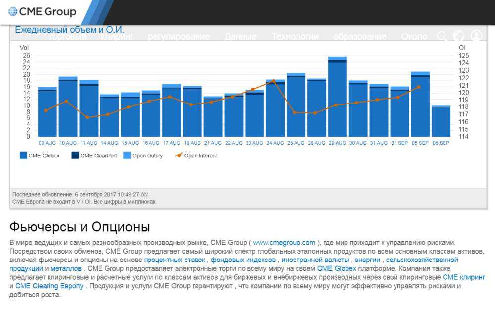- Объем торгов на самой бирже составляет более 500 миллионов контрактов. А на электронной торговой платформе Globex — более 300 миллионов контрактов.