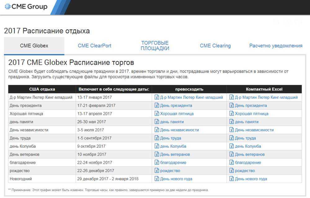 На электронной торговой платформе Globex торговля идет круглосуточно с перерывом 1 час. Информацию о праздничных и выходных днях можно найти на сайте торговой биржи. Расписание может меняться, поэтому за актуальной информацией нужно обращаться в раздел «holiday calendar».