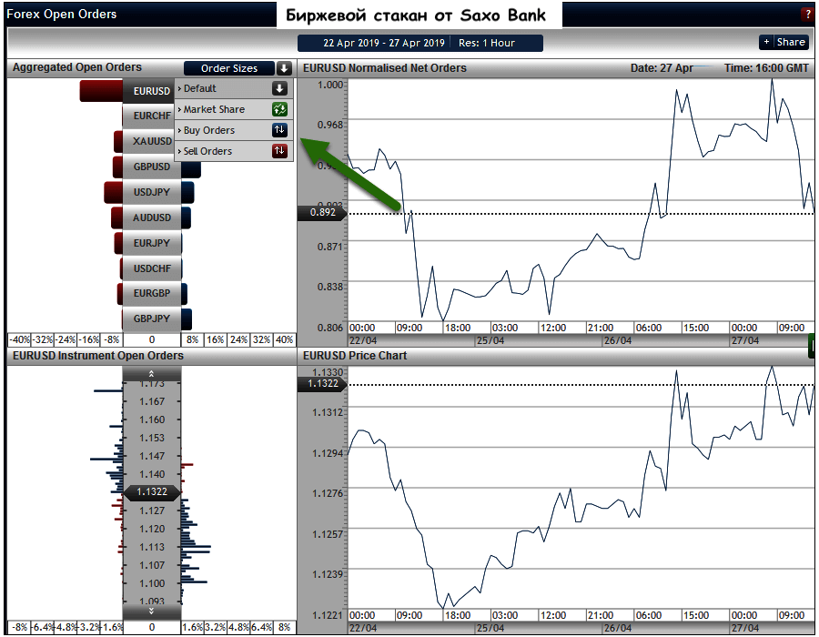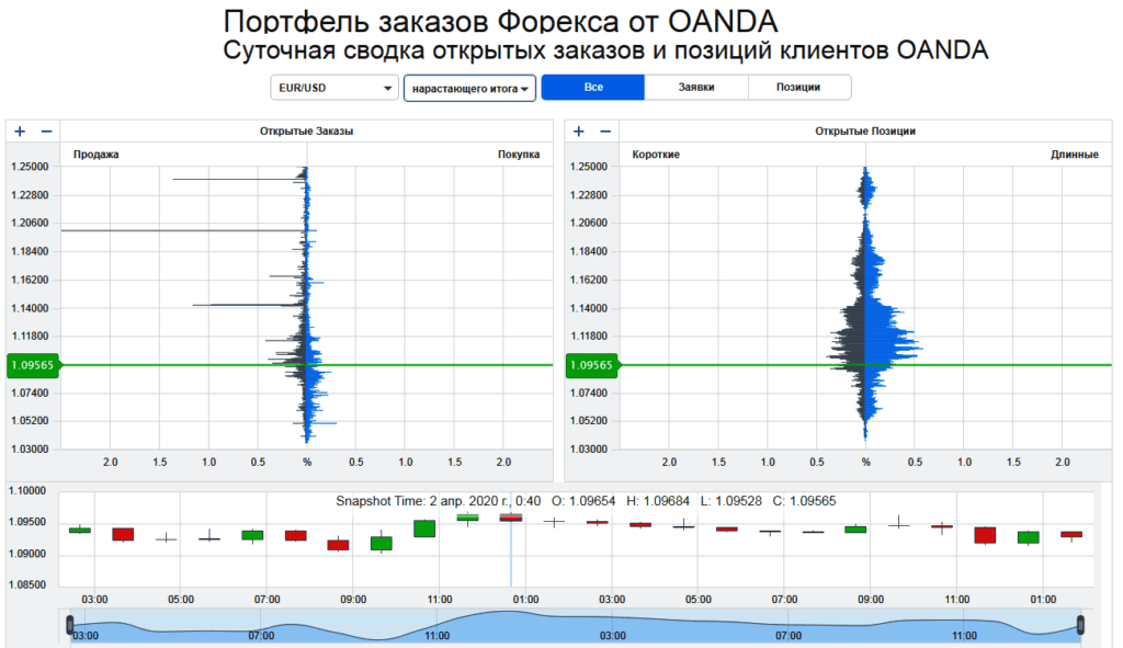 Нечто подобное есть и у forex в МТ5. Так же я нашла портфель заказов оанда. В Портфеле заказов и суточной сводке открытых заказов и позиций клиентов форекса, от оанда вы можете выбрать интересующую вас валютную пару, серебро или золото, и увидеть интересующий вас биржевой стакан онлайн. Только здесь вы увидите данные о «стоп лосах» и «тейк профитах», которые обновляются, с 20 минутной задержкой. И статистика здесь вся в процентах, а не в реальных цифрах. Такая информация окажется полезной для торговцев, практикующих скальпинг на forex. Минимальную информацию о настроении рынка здесь можно получить, но информация с 20 минутной задержкой может быть не всегда актуальной. Возможно, кто-то из Вас, сможет применять эту информацию у своего брокера бинарных опционов.