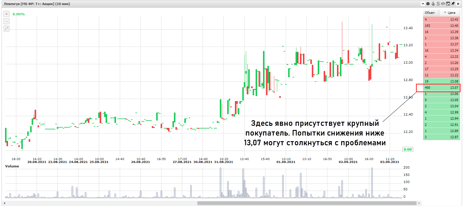 - Если положение приказа совпадает с явно видимым уровнем, то крупный приказ – подтверждение уровня. Это повышает ценность поддержки/сопротивления, от нее можно работать в Buy/Sell соответственно.