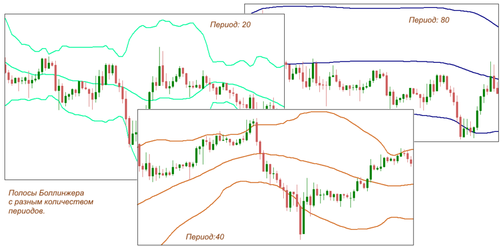 Важным параметром является период скользящих линий (волн Боллинджера). Для краткосрочной торговли он может быть равен 10-ти или 20-ти. Для среднесрочной – 20-ти, и для долгосрочной – 50-ти.