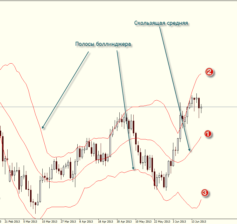 Когда цена пересекает среднюю линию Боллинджера, то это часто является сигналом к смене тренда. На рисунке в первой точке цена пересекала тренд, во второй точке ожидания были подтверждены, так как значение цены приблизилось к верхней границе.