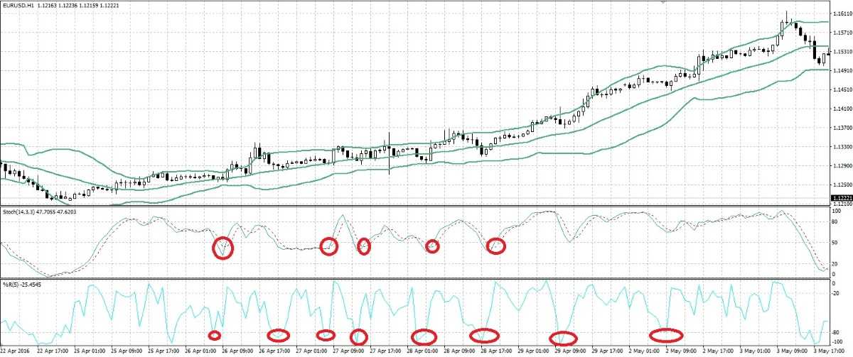 В основном Боллинджер применяется в тех трендовых системах, когда откат служит определенным толчком для входа. Поэтому целесообразно в этом случае использовать в работе стратегию с применением данных осцилляторов.