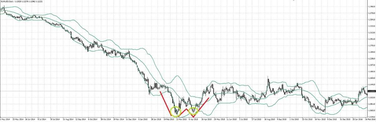 Удобно рассмотреть этот вариант на модели «двойное основание». Когда первый минимум располагается ниже уровня нижней полосы, а второй на ней или выше нее, то налицо появление дивергенции. Это можно использовать как очень надежный инструмент для торговли.