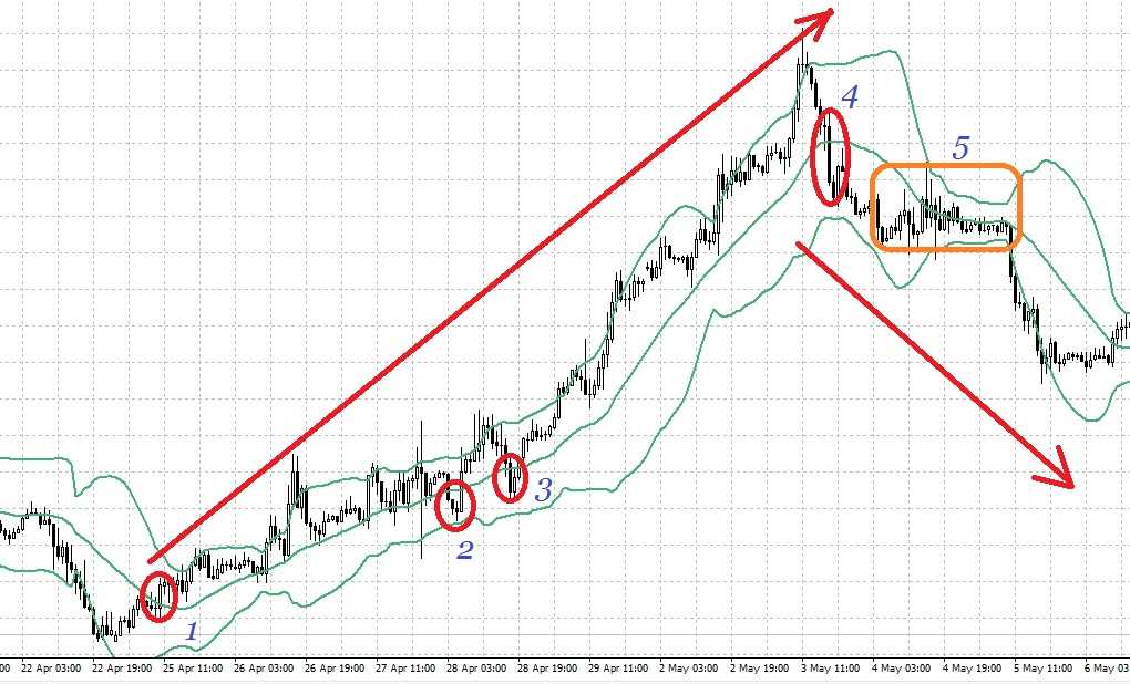 На графике цена так же часто приближалась к полосе по центру и отскакивала от нее. В двух точках – 2, 3 – тоже были подходы к центру. Даже после пробития изменение направления тренда не случилось, так как на графике продемонстрированы ложные пробои. Именно поэтому в работе, особенно начинающих трейдеров, лучше использовать несколько индикаторов и не полагаться полностью только на BB.
