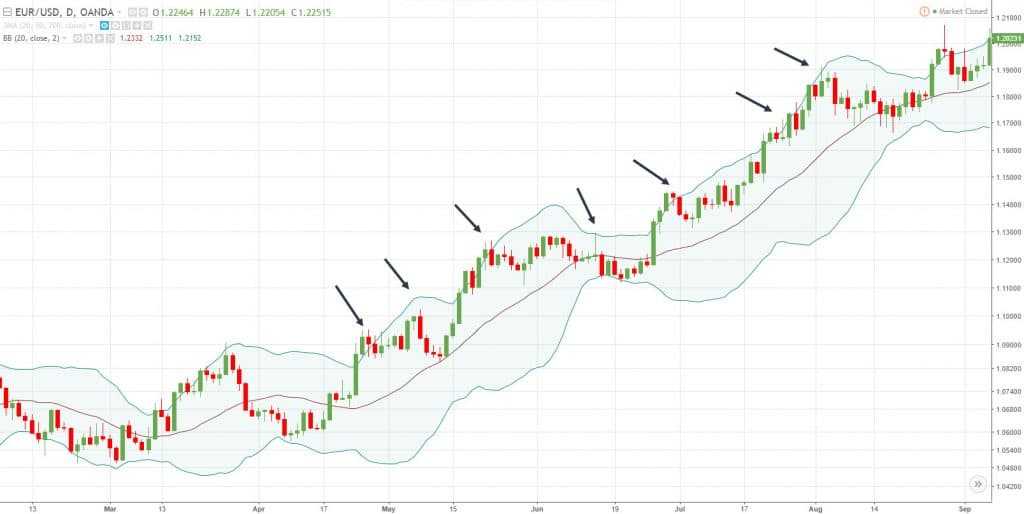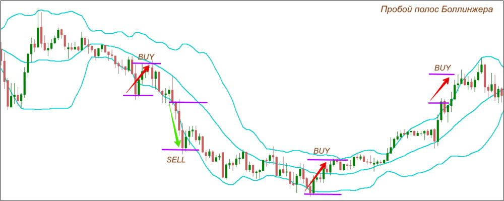 Сигнал продолжения – если пробиваются боковые линии, но тренд все еще сильный, можно не только оставлять открытыми позиции, но на откатах добавляться к противоположной либо средней линии Боллинджера.