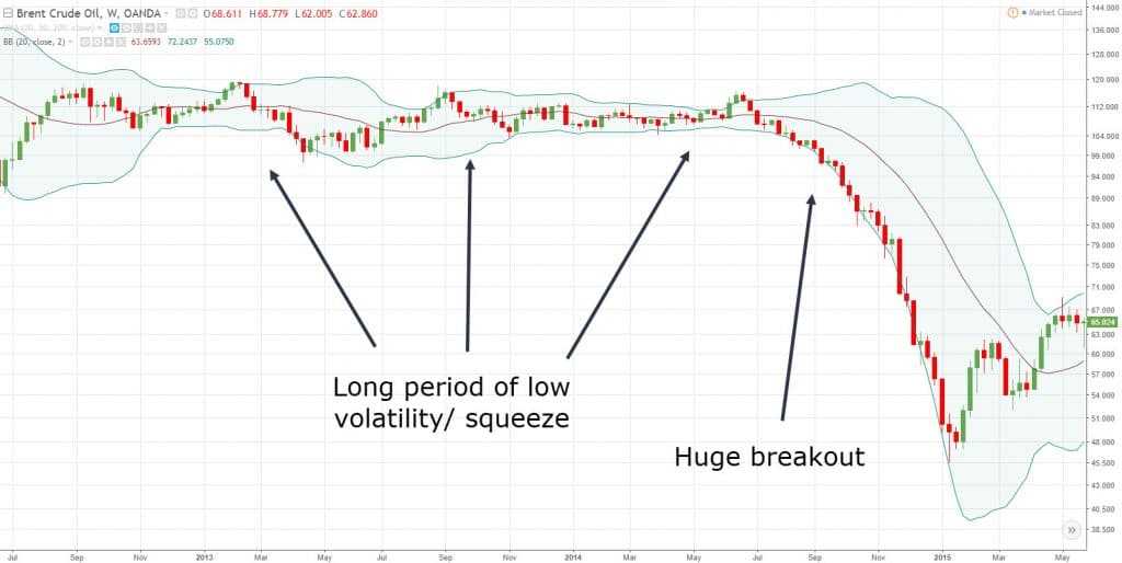 An example: Before the breakdown, Crude Oil is in a low volatility environment (as shown by the contraction of the bands).