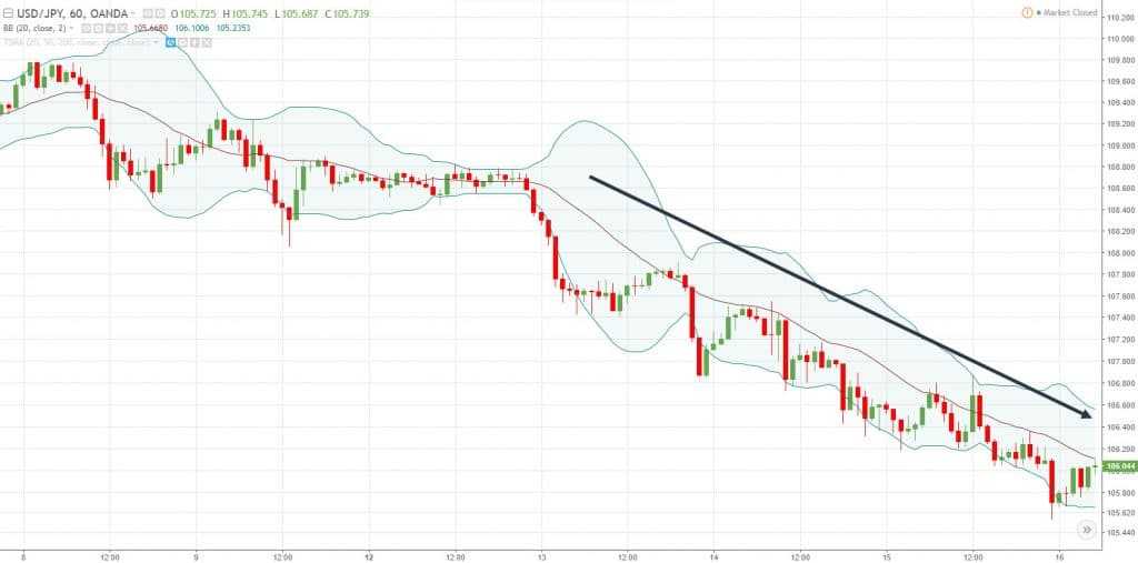 Скользящую среднюю линию SMA 20 установите на дневной график, а оба индикатора Боллинджера – на часовой график. Стратегия является очень простой, но в то же время эффективной. Торговля будет вестись исключительно по тренду.