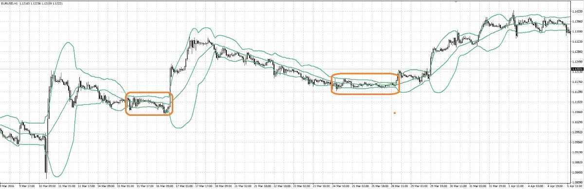 Нахождение котировки в узком коридоре индикатора на протяжении длительного времени – может ожидаться скачок волатильности и сильная тенденция.
