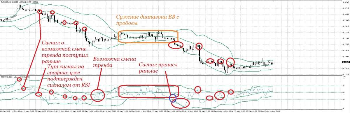 Обычно при таком сочетании появляется гораздо больше возможностей у обычных классических осцилляторов. Трейдер может заметить и динамично преобразовывающиеся уровни перекупленности и перепроданности рынка, некоторые хорошо заметны в условиях меняющихся трендов. В том числе можно провести индивидуальный анализ на основе BB, который был использован для ценового графика и схемы осциллятора RSI.