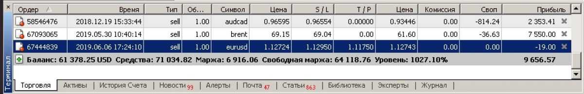 Все открытые позиции будут отображаться в разделе ”Терминал” на вкладке ”Торговля”. Здесь показаны номера ордеров, время открытия позиций, их тип (метка Sell указывает на продажу инструмента, Buy — на покупку) и объем (количеств лотов в сделке). S/L является сокращением от «Stop Loss» (Стоп Лосс), T/P — от «Take Profit» (Тейк Профит). Графа «Цена» отражает текущую стоимость актива, «Прибыль» — результат сделки.