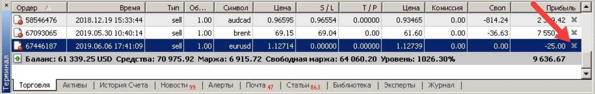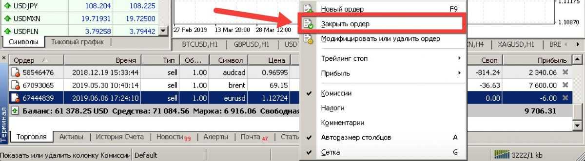 Для закрытия ордера необходимо выбрать требуемую позицию и кликнуть на ней правой клавишей мыши, после чего в появившемся окне выбрать «Закрыть ордер». После этого позиция будет закрыта и перемещена в раздел «История счета». Также для закрытия позиции можно использовать «крестик», расположенный в строке справа от показателя прибыли данной сделки.