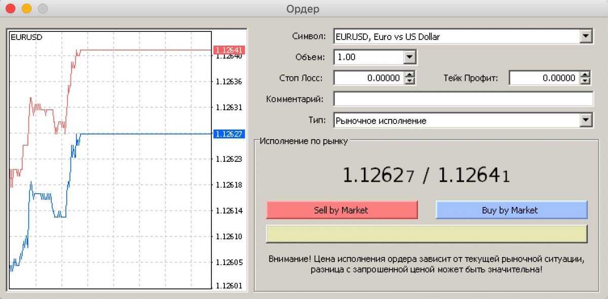 После чего перед нами открывается окно с данными по создаваемому ордеру. После выбора в поле ”Символ” тикера требуемого инструмента станут видны текущие цены его продажи или покупки. В нашем случае по паре EUR/USD можно купить евро за доллары по курсу 1.12641 или же продать за 1.12627. Цена покупки называется «Ask», цена продажи — «Bid», а разница между ними — «Spread».