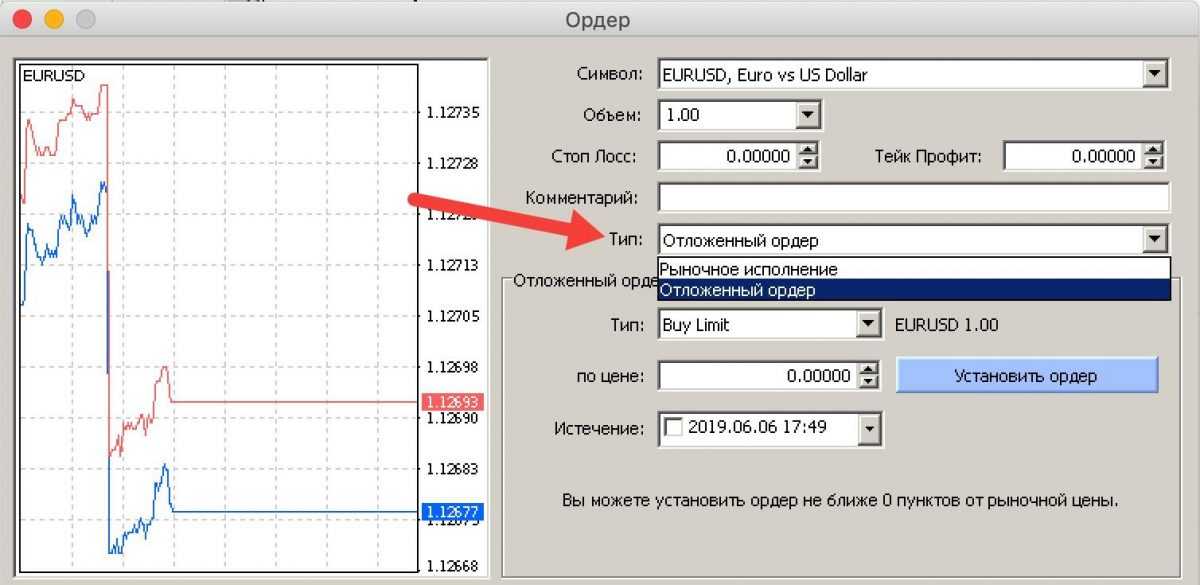 Чтобы выставить такой приказа, нужно для нового ордера в разделе ”Тип” выбрать ”Отложенный ордер”. После этого трейдеру станут доступны 4 вида этих ордеров.