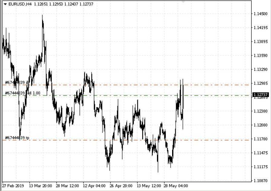 После открытия сделки она будет отображаться на графике цены. В нашем примере была открыта сделка на продажу валютной пары EUR/USD объемом 1 лот с уровнями Стоп Лосс на 1.1295 и Тейк Профит на 1.1175. Стоп Лосс представляет собой приказ брокеру на закрытие текущей позиции при достижении котировками заданной цены. Как правило, такой ордер используют для ограничения величины убытков. Тейк Профит тоже является приказом брокеру, только здесь — на закрытие позиции с расчетной прибылью.