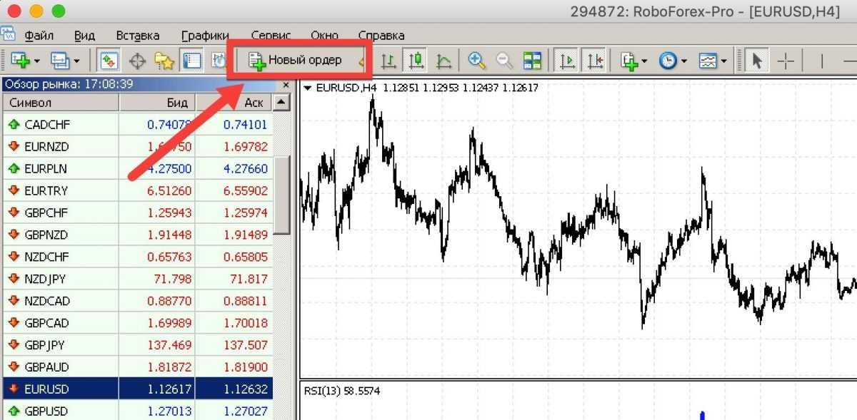 Как правило, приказ на открытие позиции подается через торговую платформу. Распоряжение на открытие позиции называется ”Ордер”. По сути, это и есть приказ брокеру купить или продать финансовый инструмент (к примеру, валютную пару EUR/USD) по текущей рыночной цене. Для совершения такой операции необходимо выбрать в торговом терминале MetaTrader 4 кнопку с надписью ”Новый ордер”.