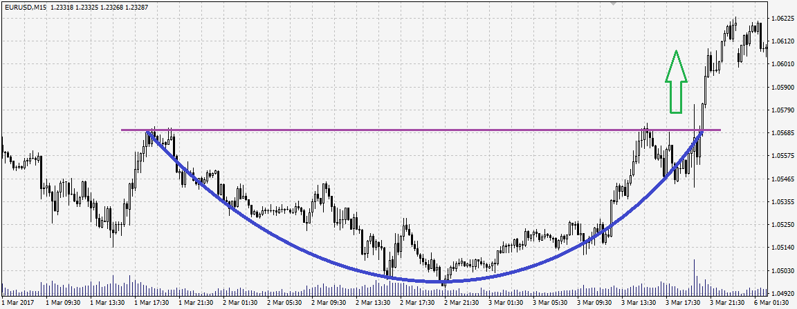 “Закругленное дно” на графике выглядит как буква »U», в связи с чем эту фигуру часто называют »блюдце». “Блюдце” формируется в результате продолжительного нисходящего движения цены. Она консолидируется в определенном диапазоне, после чего начинает расти, пробивая в конце концов уровень шеи.