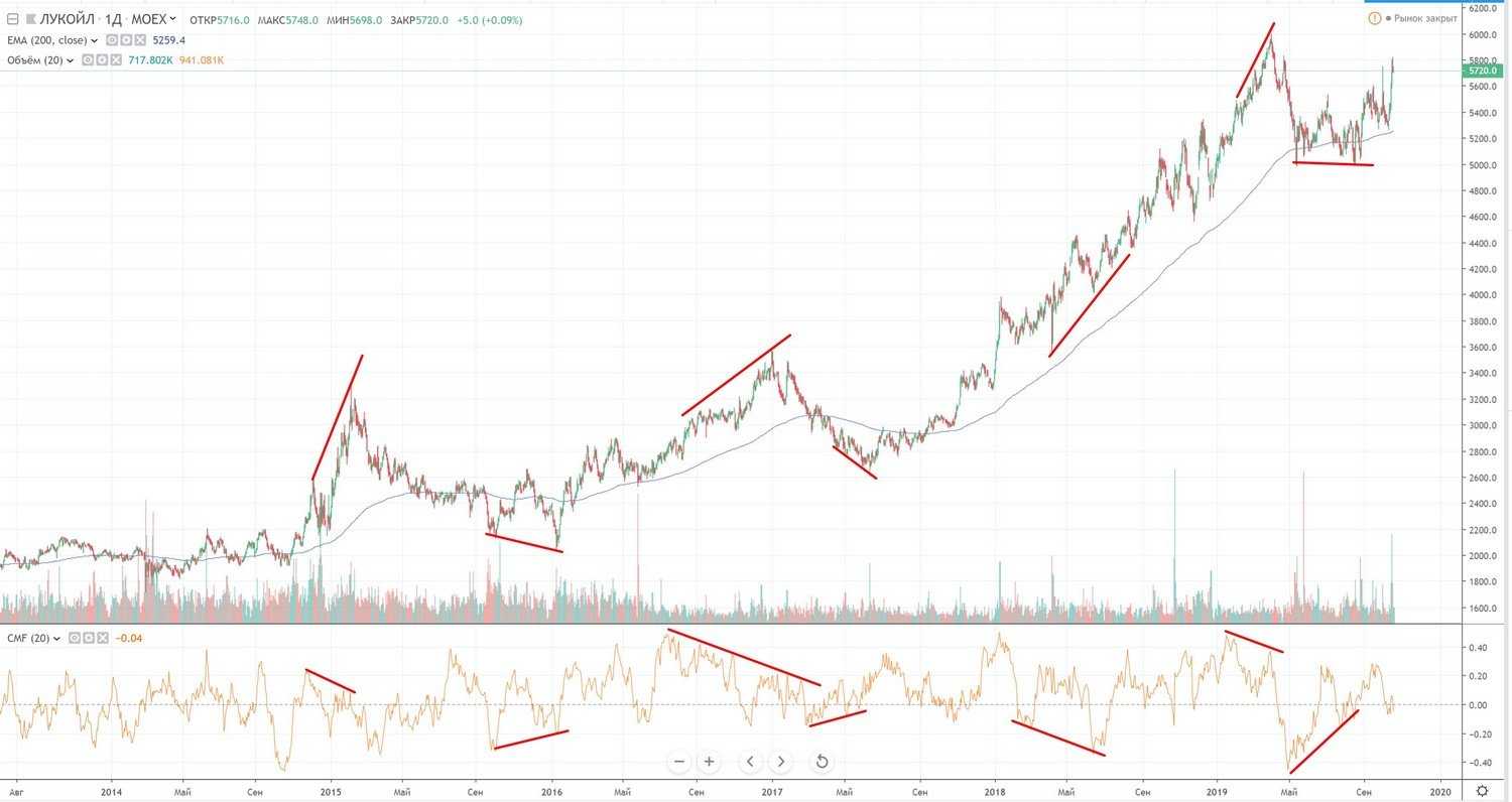 Существует индикатор денежного потока Чайкина (CMF, Chaikin Money Flow). В отличии от классических осцилляторов, он учитывает ещё и объём. Поэтому его сигналы порой очень интересны и правдивы. На нём отлично отрабатываются тренды и дивергенции: