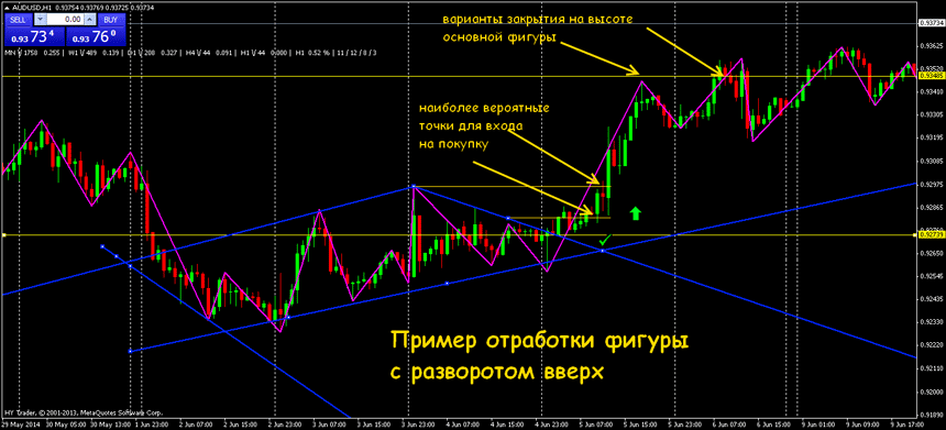 Не стоит торопиться входить в рынок сразу же после пробития верхней правой границы модели. Только когда цена пересечет высоту Н, можно открывать . Ближайшую цель можно отметить вверх на расстоянии Н (высоту фигуры). Страховочный разумно выставить на уровне локального минимума паттерна.