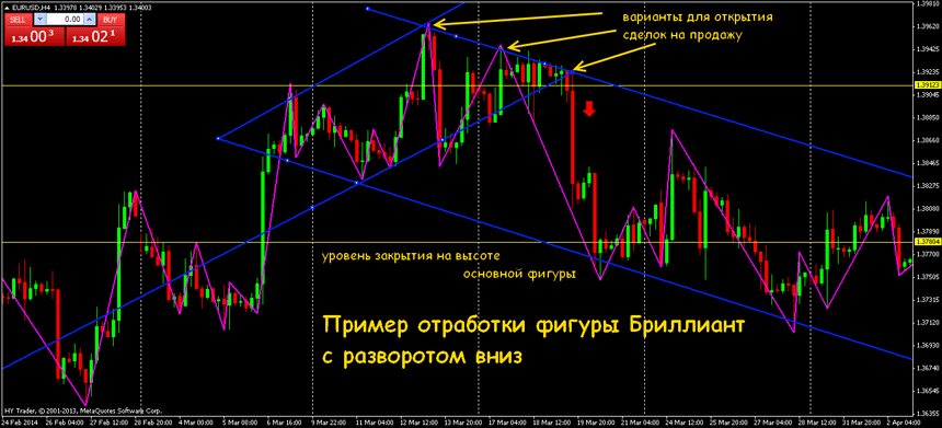 - Агрессивный, когда позиции открываются непосредственно по рыночным ценам или с помощью отложенных ордеров на пробитии трендовых линий. С учетом особенностей формирующегося «Бриллианта» это может быть дно или вершина рынка.