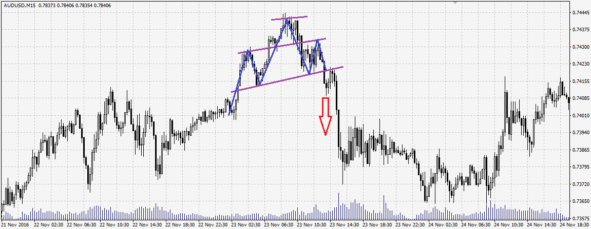 Эта фигура высшего пилотажа означает активную борьбу между медведями и быками, поэтому там есть периоды роста и падения, и в оптимальном варианте это должны быть одинаковые по времени периоды. Но в реале первый участок более длительный.