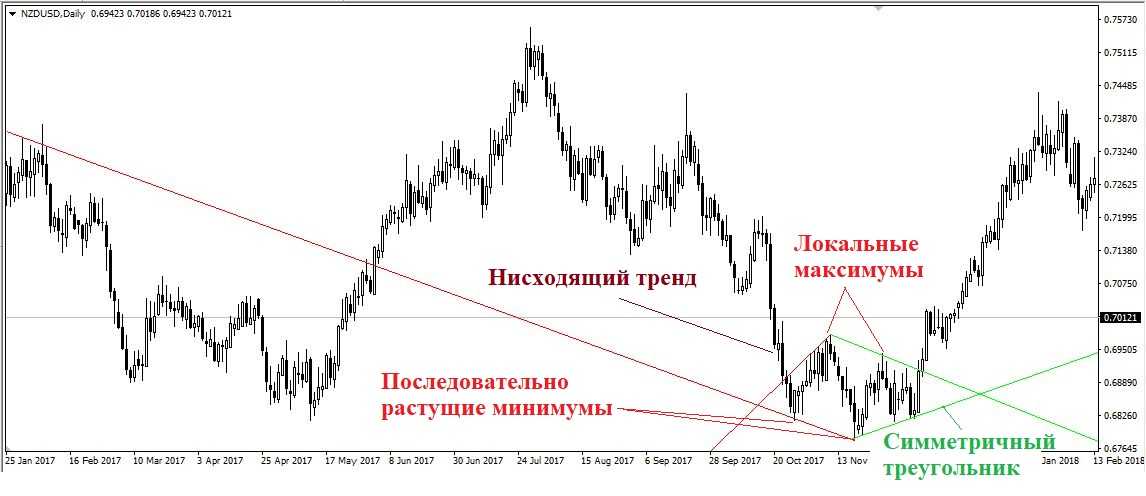 Затем следуют несколько сужающихся колебаний, следующие за пиковыми котировками. В итоге экстремумами будет сформирован симметричный (правый) треугольник, образующий паттерн. Это будет показатель того, что рынок входит в стадию консолидации.