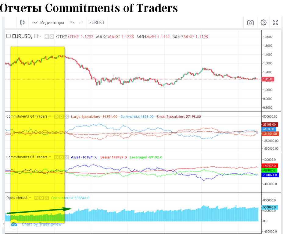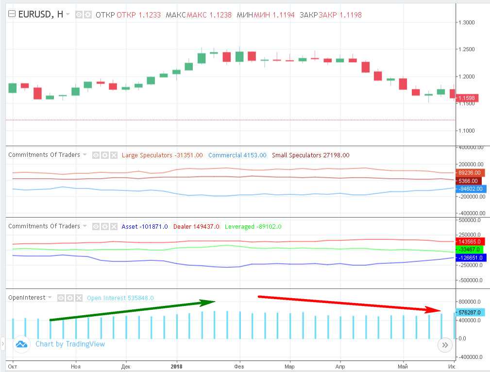 Когда зеленая линия находится в самом низу графика, это означает, что число позиций шорт (вниз) увеличивается. Их все больше и больше, участники рынка продают и играют на понижение. Эта игра не может продолжаться вечно, и когда настроение рынка меняется, число контрактов в лонг увеличивается. Соответственно, разворачивается и цена.